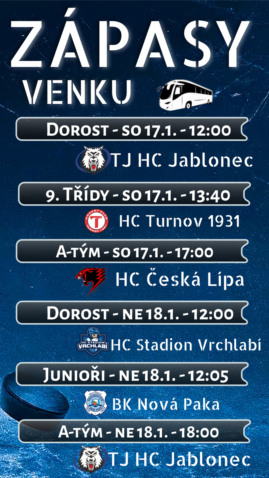 Rozpisy utkání našich kategorií na nadcházející víkend 16-18.01. 2026.