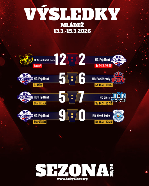 Výsledky mládežnických kategorií HC Frýdlant z víkendu 1. březen - 8. březen 2026.